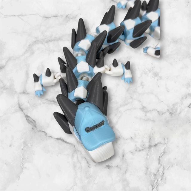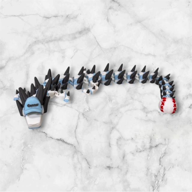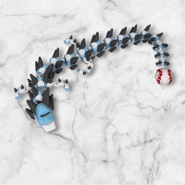This 3D printed articulated dragon is designed with bold gray scales, icy blue accents, and a baseball tail that makes it a home run gift for any sports fan. Also, available in your favorite team colors! Choose your own color combination to match your school, league, or pro team for the perfect custom piece.
