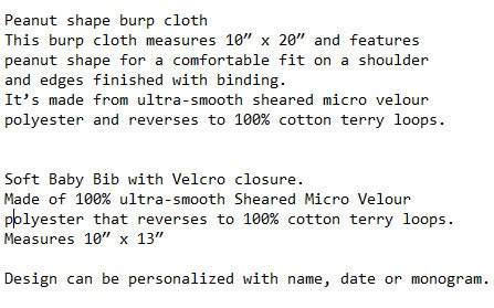 This burp cloth measures 10″ x 20″ and features a peanut shape for a comfortable fit on a shoulder and edges finished with binding.